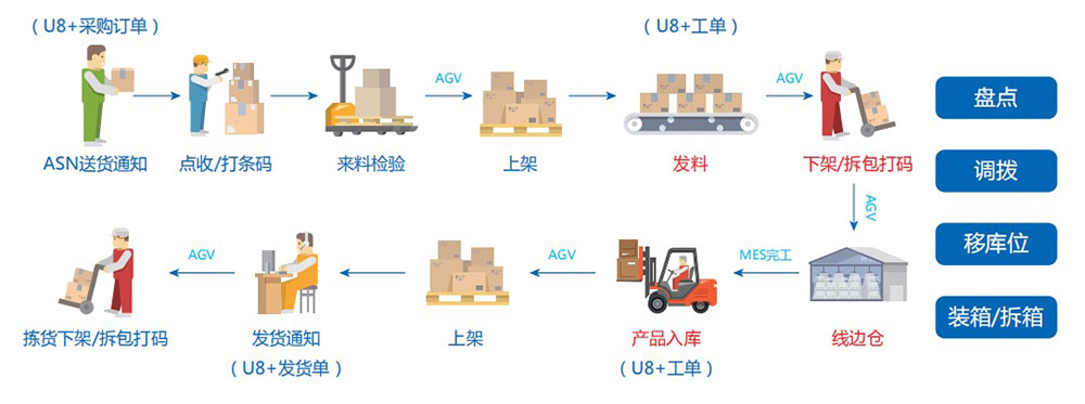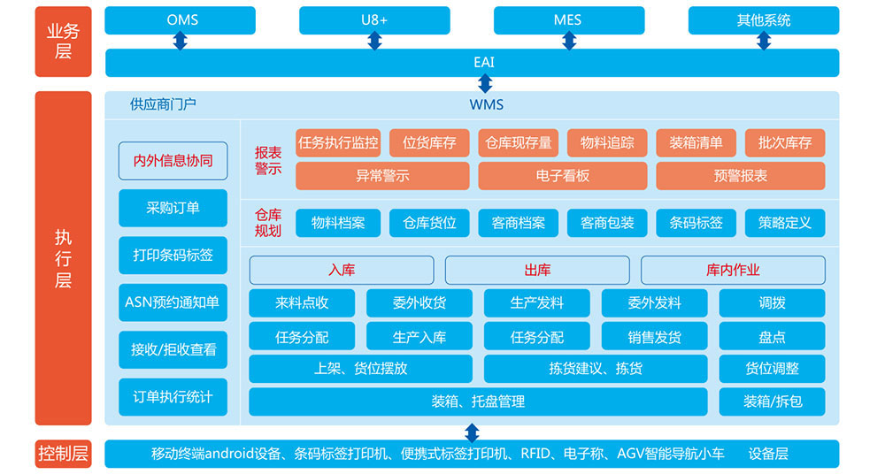 对接客栈管理系统(WMS),集成种种装备数据,监控和统一调理堆垛机、机械人、AGV系统等底层物流装备,高效执行妄想好的营业流程。